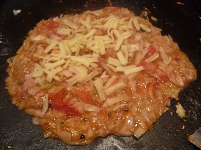生地の半分に地中海もんじゃのチーズを混ぜ込み(これも後から乗せればよかったかも?)