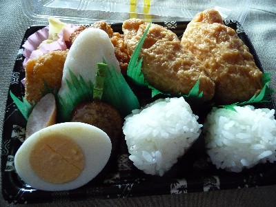 (塩むすび、いなり、コロッケ、唐揚げ、ゆで卵、かまぼこ、つくねタレ和え、ウインナー、たくわん)