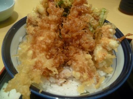 かき揚げ、海老天、牡蠣天、いんげん天・・・下のごはんが見えないくらい乗っている。