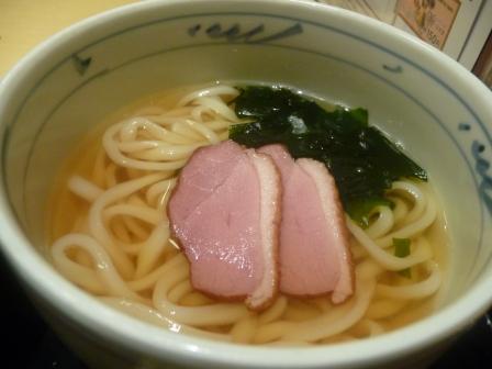 細めのうどんに薄味のだし。合鴨はパウチのハムの味(悲)