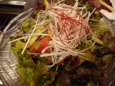 レタスたっぷり、きゅうり・トマトの特製ドレッシングが掛かったサラダ。