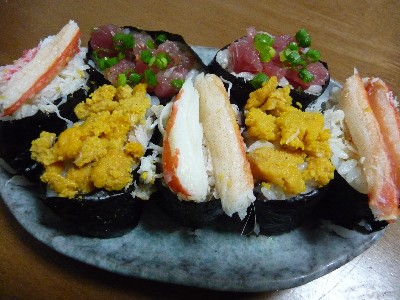 三色軍艦(うに/かに/まぐろ):450kca (l酢飯、かに、蒸しうに、まぐろ切り落とし、のり、醤油)