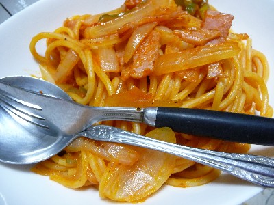 ナポリタン:646kcal (スパゲッティ、ベーコン、玉ねぎ、ピーマン、バター、ケチャップ)
