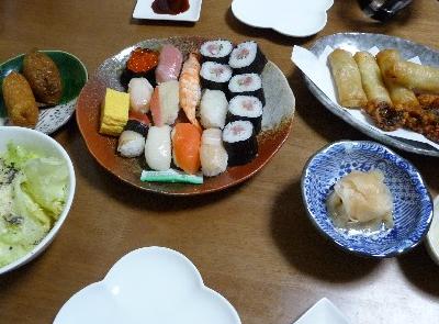 寿司:500kcal (中トロ、えび、すずき、金目鯛、いか、ほたて、ねぎとろ巻4つ、厚焼玉子、ガリ)