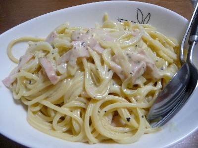 (スパゲッティ、ショルダーベーコン、玉ねぎ、卵黄、パルメザンチーズ、牛乳、バター、粗挽き黒胡椒)