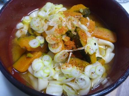 (玉うどん:240kcal かぼちゃのみそ汁:120kcal 長ねぎ:3kcal めんつゆ:17kcal)