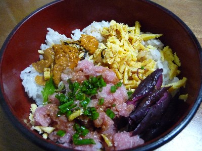 (酢飯+ごはん、ねぎとろ、うに、錦糸卵、柴漬け、しょうゆ)