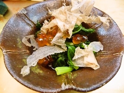ほうれん草、いくらをかつおぶしとポン酢でさっぱりと。