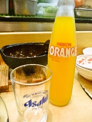 お酒を飲んでる2人を待つ間、久しぶりにビンのオレンジジュース。