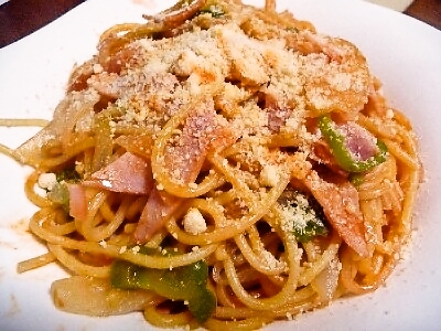(スパゲティ、ハム、ピーマン、玉ねぎ、ケチャップ、バター、塩、胡椒、パルメザンチーズ、タバスコ)