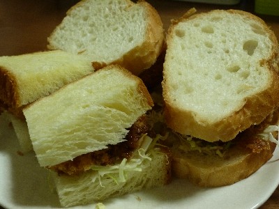 (バケット、デニッシュ、一口ひれかつ 2個@和幸〔444kcal〕、キャベツ、ソース)