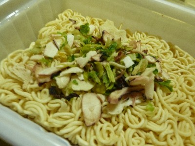 フタを開けるとすでに麺の上にかやくが乗っている状態。