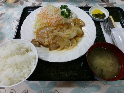 ごはん・豆腐とわかめのみそ汁・しょうが焼〔豚3枚、キャベツの千切り〕、香物