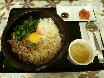 石焼ビビンバ:731kcal (ごはん、牛肉、菜の花、大根、大豆もやし、卵黄、コチュジャン、キムチ)