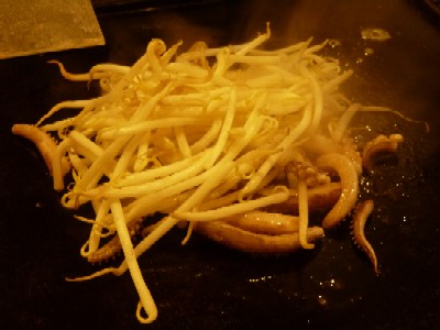 鉄板にバターを溶かし、げそを軽く炒めて、もやしを投入。