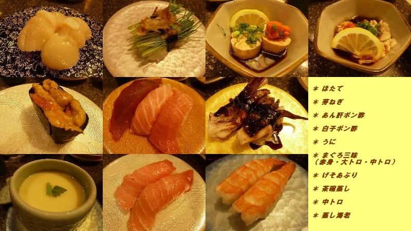 (ほたて、芽ねぎ、うに、まぐろ三昧〔赤身・中トロ・大トロ〕、げぞあぶり、中トロ、蒸し海老)
