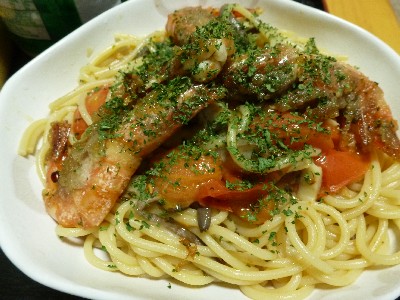 (スパゲティ、有頭海老のアヒージョ風、トマト、ひらたけ、オリーブ油、パルメザンチーズ、タバスコ)