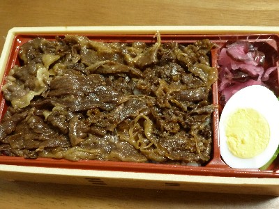 (白米、牛めし具〔牛肉、玉ねぎ、こんにゃく〕、味付ゆで玉子、味付小松菜、しば漬け)
