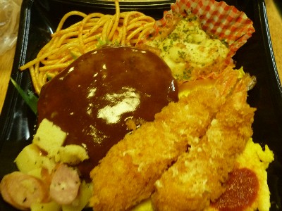 ご飯、ハンバーグ、エビフライ、カレー風味ポテトグラタン、ナポリタンスパゲティ、スクランブルエッグ、じゃがいもウインナー炒め、薄焼卵