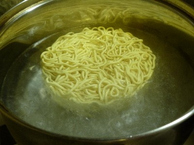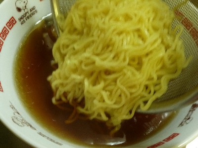 400mlくらいのお湯で溶いたスープにしっかり湯切りした麺を投入。
