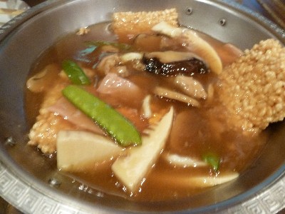 大きなおこげ3枚に豚肉、イカ、ハム、人参、絹さや、椎茸、マッシュルーム...