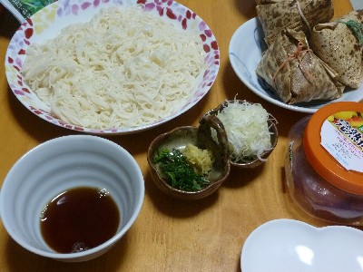 そうめん:402kcal (そうめん、めんつゆ、長ねぎ、しょうが、しそ、すりごま)