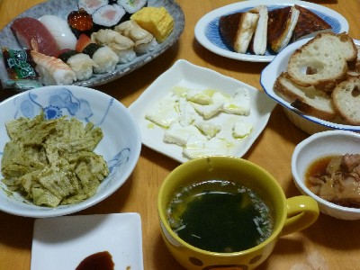 寿司:355kcal(まぐろ、いか、えび、蒸しほたて、ほっき貝、ねぎとろ巻、玉子〔つまみ〕)