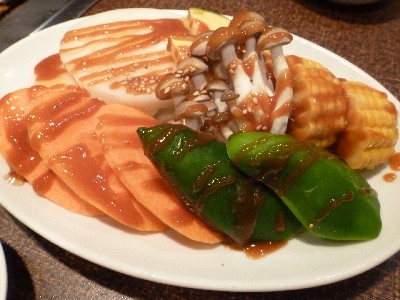 野菜焼:76kcal(玉ねぎ、かぼちゃ、しめじ、とうもろこし、人参、ピーマン)