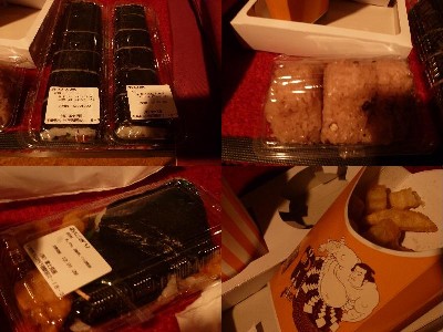 (ごはん、カリカリ梅、だし巻き玉子、かまぼこ、伊達巻、鮭、煮物〔たけのこ、ごぼう、椎茸、海老、麩〕、角煮、湯葉巻き、帆立照り焼き、かにかま)