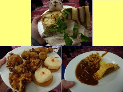 唐揚げ 2コ、帆立のカナッペ 2つ、やきとり〔つくね、もも〕、