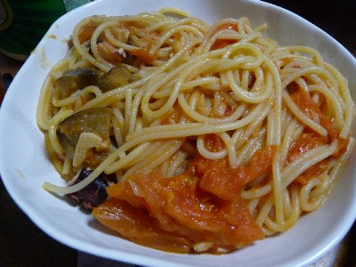 (スパゲティ、たこ、トマトとなすのガーリックソテー、にんにく、オリーブ油、パルメザンチーズ、タバスコ)