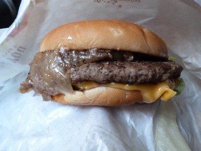 大きいパティの上にソテーしたビーフとオニオンが乗っかってました。