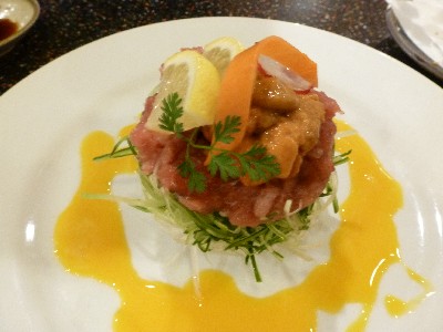 ユッケ風に味つけされたまぐろ、そのうえにはうに!
