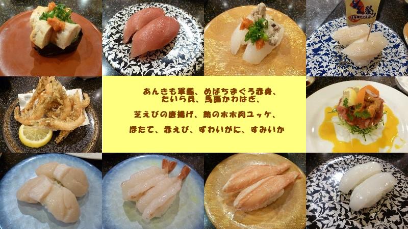 (あんきも軍艦、めばちまぐろ赤身、たいら貝、馬面かわはぎ、ほたて、赤えび、ずわいがに、すみいか)