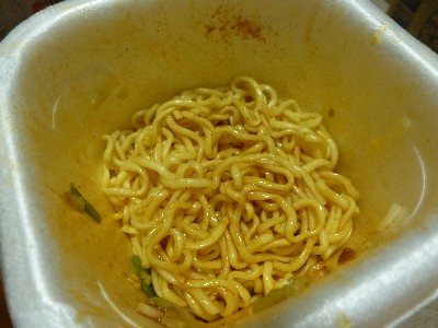 かやくを麺の上に入れてお湯を注いで3分・・・液体ソースを入れてかき混ぜる。