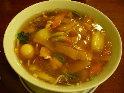 豚、海老、うずら玉子、たけのこ、人参、青梗菜・・・具だくさんのあんかけ麺。