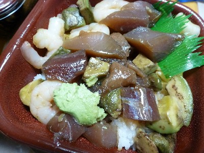 マグロアボカド丼+うに@丼丸:691kcal (酢飯、マグロ、アボカド、エビ、しょうゆ、ガリ)(+うに)