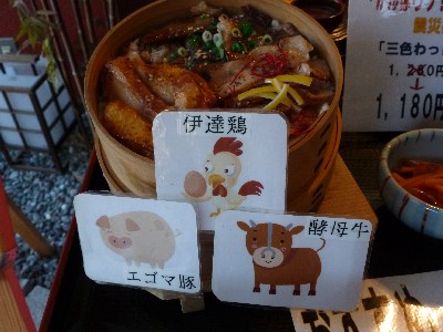 伊達鶏、エゴマ豚、酵母牛がのったわっぱ飯。
