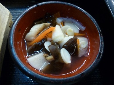 里芋や人参、山菜、きくらげ(これも山菜か)が薄味のだしで仕上げてあり、あっさりしてました。