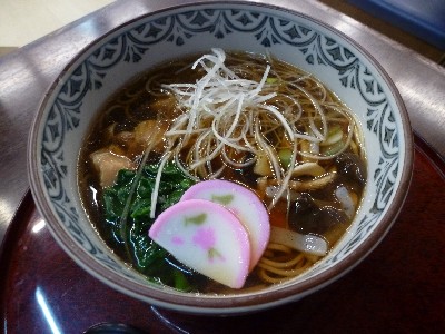 つゆは甘め。小鉢のこづゆと同じ具材+鶏肉、青菜(食べてないので種類不明)、かまぼこ、ねぎ。