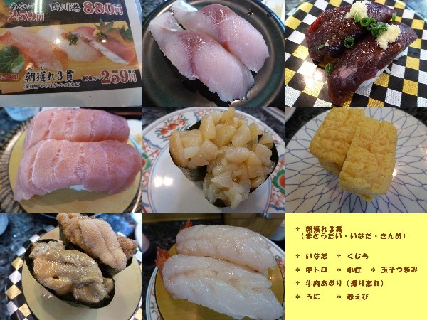 (朝獲れ3貫〔まとうだい、いなだ、きんめだい〕、いなだ、くじら、中トロ、小柱、牛肉あぶり、うに、赤えび、玉子つまみ、ガリ)