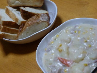 クリームシチュー:636kcal(豚肉、じゃがいも、人参、玉ねぎ、コーン、シチュールー、牛乳)