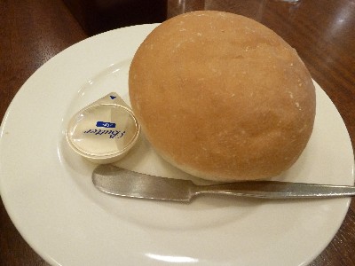 ハンバーグソースをつけてみたり、付いていたバターをたっぷり塗って食べたり。