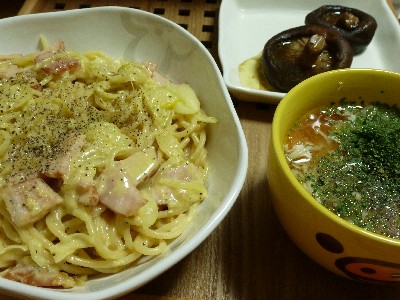 (スパゲティ、卵黄、ハム、玉ねぎ、にんにく、オリーブ油、牛乳、パルメザンチーズ、胡椒)