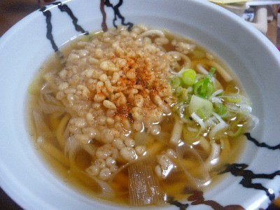 たぬきうどん:340kcal (玉うどん、めんつゆ、揚げ玉、長ねぎ、唐辛子)