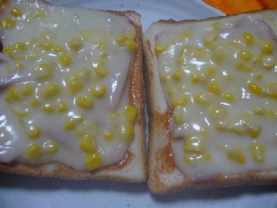 ピザトースト風:525kcal (食パン〔8枚切・2枚〕、チーズ2枚、コーン、ハム、ケチャップ)