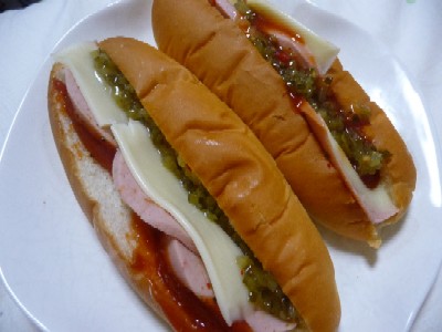 (ホットドック〔2本・117kcal/1本あたり〕、パプリカハム、チーズ1枚、カクテルソース、ピクルス)