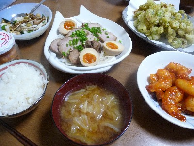 煮豚と煮玉子、オニオンサラダ:297kcal(煮豚、煮玉子、新玉ねぎ、子ねぎ)